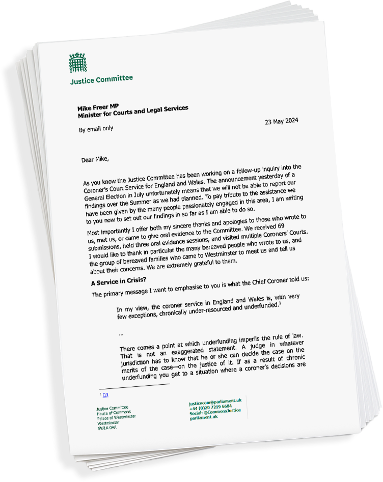 We’re calling on the UK Government to reform the Coroners and Justice Act 2009 and The Coroners (Investigations) Regulations 2013 to: